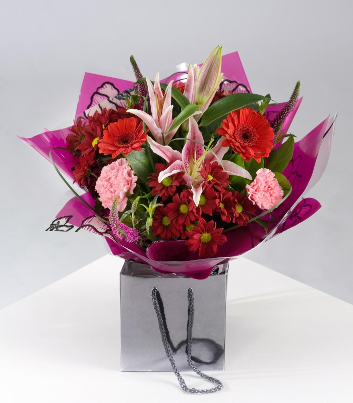 This romantic hand-tied bouquet of mixed red and pink flowers is delivered is a stylish bag.