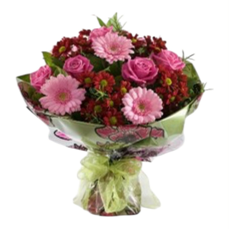 Celebrate Mom with a bouquet that radiates warmth and affection. This stunning arrangement features a vibrant mix of pink gerbera daisies and lush fuchsia roses, accented by the rich, autumnal tones of burgundy spray chrysanthemums. Wrapped in a refreshing lime-green finish, it is a bold and beautiful way to show your appreciation.