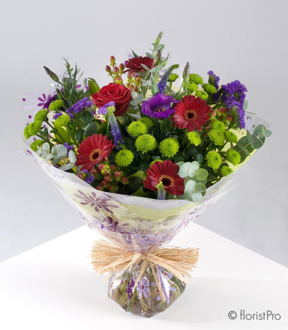A traditional handtied bouquet of mixed greens, reds and purple flowers.