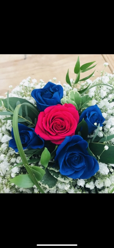 A Gypsophila heart with a grouping Rose spray