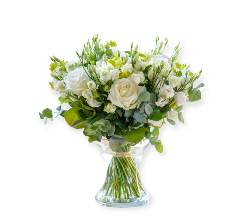 A traditional sympathy arrangement which features soft whites and greens.
